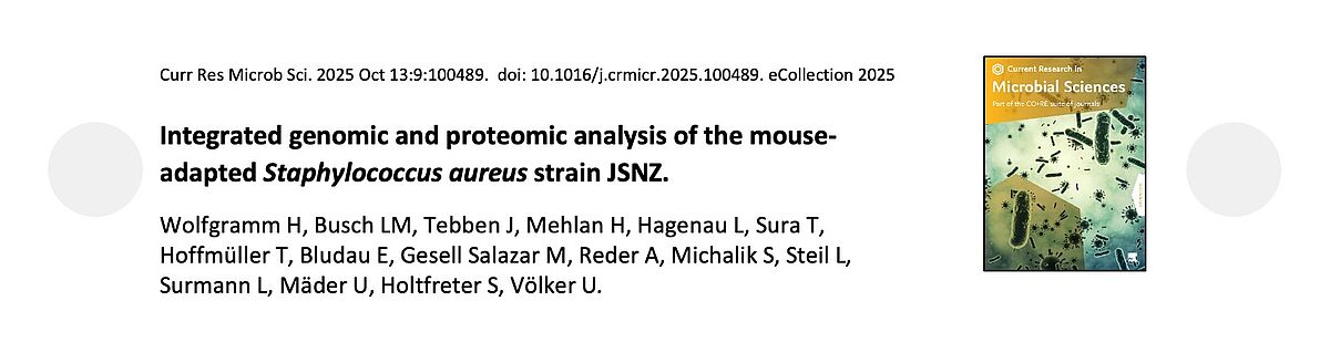 | Wolfgramm H, Busch LM, Tebben J, Mehlan H, Hagenau L, Sura T, Hoffmüller T, Bludau E, Gesell Salazar M, Reder A, Michalik S, Steil L, Surmann K, Mäder U, Holtfreter S, Völker U (2025) Integrated genomic and proteomic analysis of the mouse-adapted Staphylococcus aureus strain JSNZ. Curr Res Microb Sci. 9:100489. ArtikelPubmedRelated |