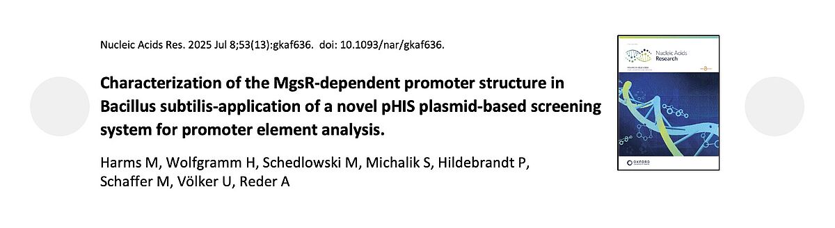 | Harms M, Wolfgramm H, Schedlowski M, Michalik S, Hildebrandt P, Schaffer M, Völker U, Reder A (2025) Characterization of the MgsR-dependent promoter structure in Bacillus subtilis-application of a novel pHIS plasmid-based screening system for promoter element analysis. Nucleic Acids Res. 53. ArtikelPubmedRelated |