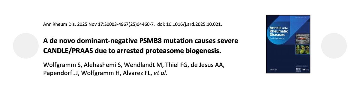 Wolfgramm S, Alehashemi S, Wendlandt M, Thiel FG, de Jesus AA, Papendorf JJ, Wolfgramm H, Alvarez FL, Borngräber E, Uss K, Bhuyan F, Metpally A, Steil L, Hentschker C, Venz S, Abdulla RA, Poirier L, Friend C, Casta FC, Horkayne-Szakaly I, Akoghlanian S, Mustillo PJ, Abraham RS, Bastard P, Moura TCL, Dorna MB, Kozu KT, Kers J, Teng YKO, Bredius RGM, Palmblad K, Horne A, Brodin P, Blanco-Lobo P, Bernabeu-Wittel J, Fernandez-Silveira L, Neth O, Pagnier A, Boursier G, Tusseau M, Huizinga TWJ, Fournier B, Neven B, Völker U, Santen GWE, Brenchley JM, Calvo KR, Kleiner D, Ebstein F, Krüger E, Goldbach-Mansky R (2025) A de novo dominant-negative PSMB8 mutation causes severe CANDLE/PRAAS due to arrested proteasome biogenesis. Ann Rheum Dis. 10:882-889. ArtikelPubmedRelated |