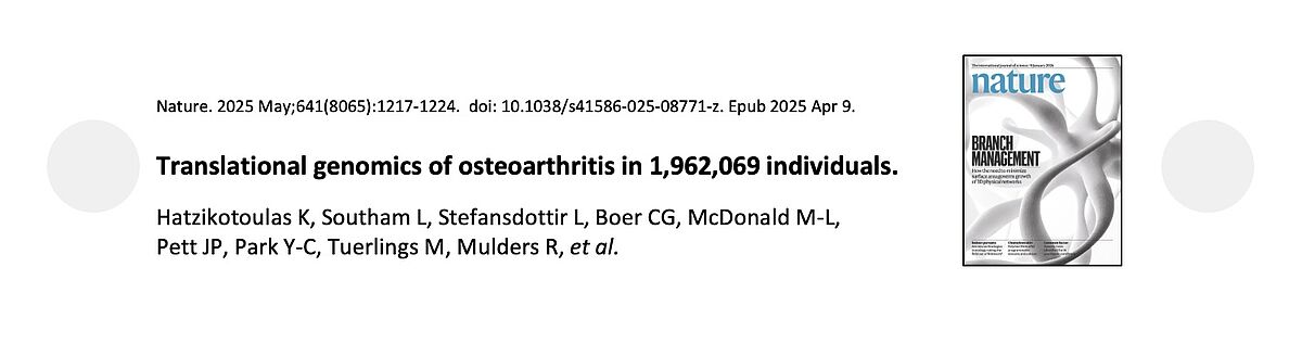 Hatzikotoulas K, Southam L, Stefansdottir L, Boer CG, McDonald M, Pett JP, Park Y, Tuerlings M, Mulders R, Barysenka A, Arruda AL, Tragante V, Rocco A, Bittner N, Chen S, Horn S, Srinivasasainagendra V, To K, Katsoula G, Kreitmaier P, Tenghe AMM, Gilly A, Arbeeva L, Chen LG, de Pins AM, Dochtermann D, Henkel C, Höijer J, Ito S, Lind PA, Lukusa-Sawalena B, Minn AKK, Mola-Caminal M, Narita A, Nguyen C, Reimann E, Silberstein MD, Skogholt A, Tiwari HK, Yau MS, Yue M, Zhao W, Zhou JJ, Alexiadis G, Banasik K, Brunak S, Campbell A, Cheung JTS, Dowsett J, Faquih T, Faul JD, Fei L, Fenstad AM, Funayama T, Gabrielsen ME, Gocho C, Gromov K, Hansen T, Hudjashov G, Ingvarsson T, Johnson JS, Jonsson H, Kakehi S, Karjalainen J, Kasbohm E, Lemmelä S, Lin K, Liu X, Loef M, Mangino M, McCartney D, Millwood IY, Richman J, Roberts MB, Ryan KA, Samartzis D, Shivakumar M, Skou ST, Sugimoto S, Suzuki K, Takuwa H, Teder-Laving M, Thomas L, Tomizuka K, Turman C, Weiss S, Wu TT, Zengini E, Zhang Y, Consortium A, ARGO Consortium , DBDS Genomic Consortium , Estonian Biobank Research Team , FinnGen , Genes & Health Research Team , HUNT All-In Pain , Million Veteran Program , Regeneron Genetics Center , Ferreira MAR, Babis G, Baras A, Barker T, Carey DJ, Cheah KSE, Chen Z, Cheung JP, Daly M, de Mutsert R, Eaton CB, Erikstrup C, Furnes ON, Golightly YM, Gudbjartsson DF, Hailer NP, Hayward C, Hochberg MC, Homuth G, Huckins LM, Hveem K, Ikegawa S, Ishijima M, Isomura M, Jones M, Kang JH, Kardia SLR, Kloppenburg M, Kraft P, Kumahashi N, Kuwata S, Lee MTM, Lee PH, Lerner R, Li L, Lietman SA, Lotta L, Lupton MK, Mägi R, Martin NG, McAlindon TE, Medland SE, Michaëlsson K, Mitchell BD, Mook-Kanamori DO, Morris AP, Nabika T, Nagami F, Nelson AE, Ostrowski SR, Palotie A, Pedersen OB, Rosendaal FR, Sakurai-Yageta M, Schmidt CO, Sham PC, Singh JA, Smelser DT, Smith JA, Song Y, Sørensen E, Tamiya G, Tamura Y, Terao C, Thorleifsson G, Troelsen A, Tsezou A, Uchio Y, Uitterlinden AG, Ullum H, Valdes AM, van Heel DA, Walters RG, Weir DR, Wilkinson JM, Winsvold BS, Yamamoto M, Zwart J, Stefansson K, Meulenbelt I, Teichmann SA, van Meurs JBJ, Styrkarsdottir U, Zeggini E (2025) Translational genomics of osteoarthritis in 1,962,069 individuals. Nature. 641:1217-1224. ArtikelPubmedRelated |